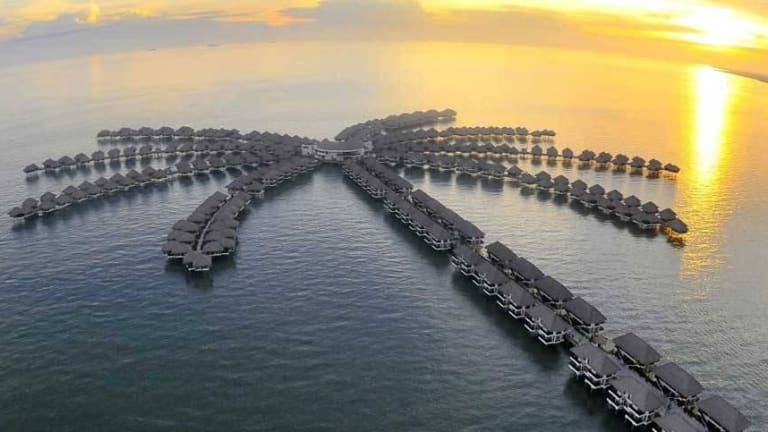 Seaside overwater villa resort in sepang, with a stunning sunset scene.