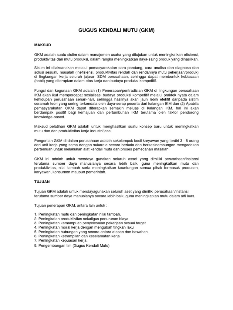 Gugus kendali mutu (gkm) merupakan kegiatan yang dilakukan oleh sekelompok orang dalam perusahaan dengan goal untuk melakukan peningkatan yang berkelanjutan bagi perusahaan tersebut.